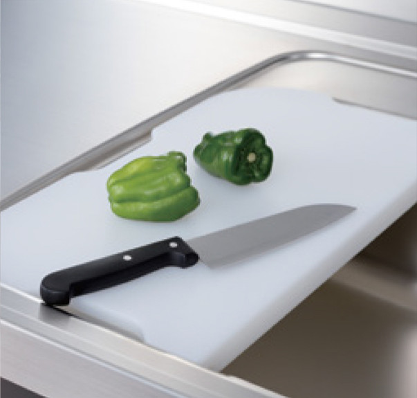 Công dụng: gác trên ray dùng để cắt như thớt thông thường hay làm tấm đậy mặt chậu,tăng diện tích thao tác bếp.
