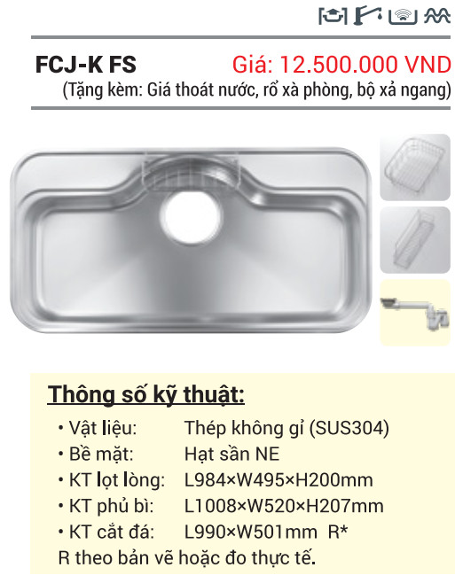 Thông số kỹ thuật Chậu rửa chén 1 hố Nhật Bản Shigeru FCJ-K FS: