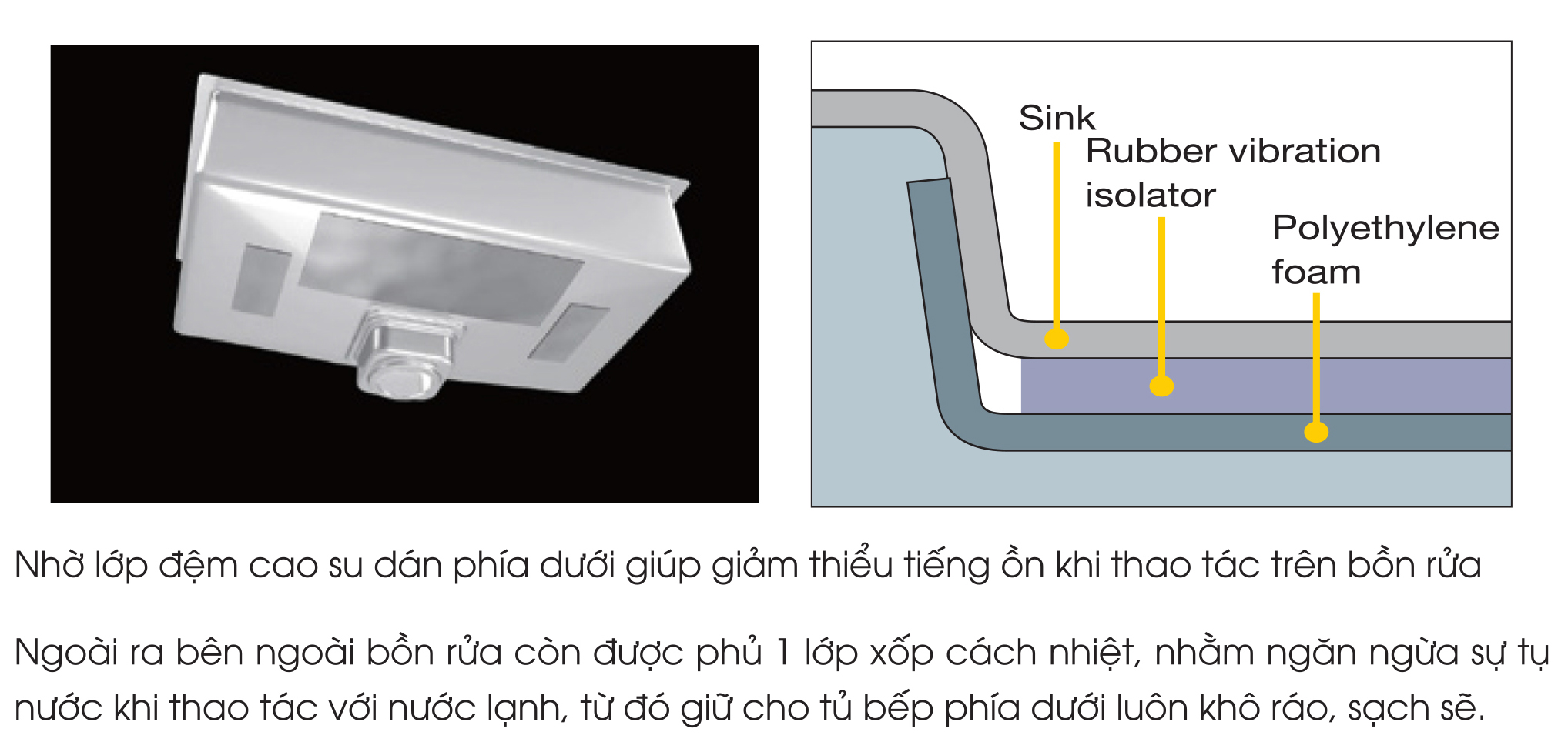 – Lớp lót mặt dưới đáy chậu gồm 2 lớp: Rubber và màng Polyethylene giúp cách âm chống ồn và chống ngưng tụ hơi nước hiệu quả.