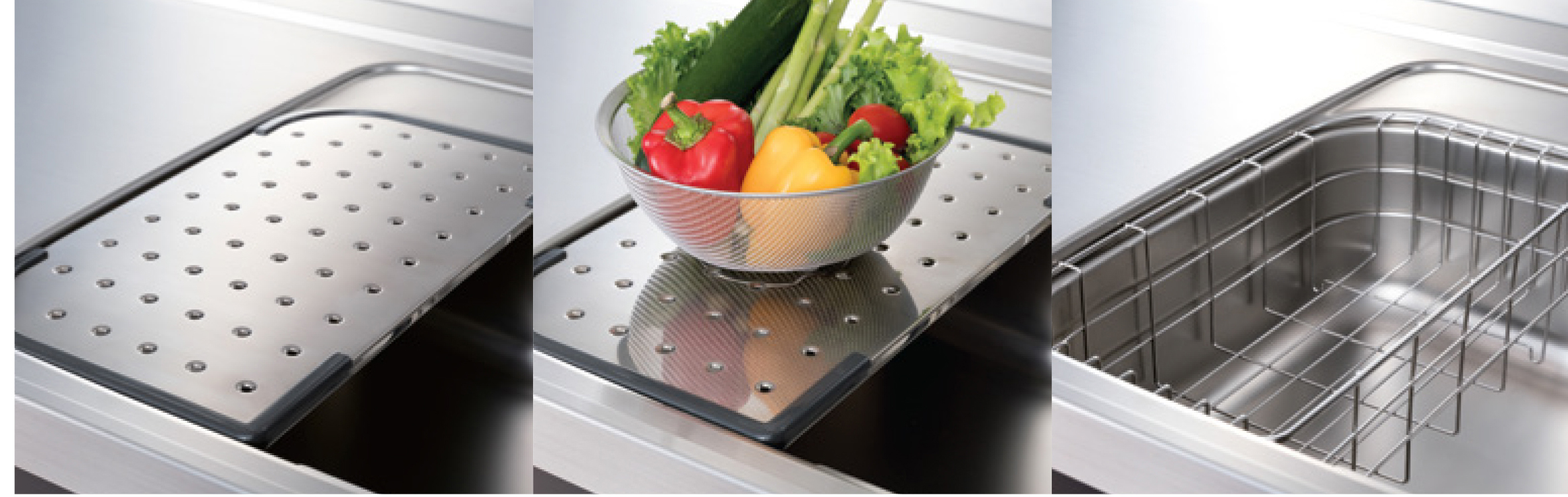 Công dụng: gác trên ray giúp làm cá, trụng mì trong lòng chậu không bị chảy tràn nước trên mặt bếp lại an toàn và vệ sinh vì cao hơn đáy chậu.