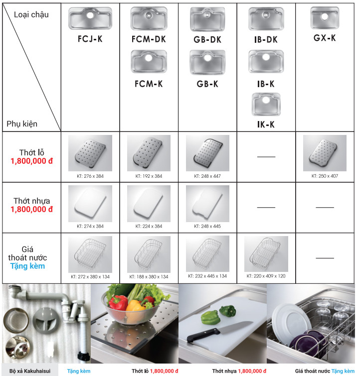 Lưu ý: Đơn giá trên đã bao gồm 1 bộ xiphong, 1 khay inox để xà phòng và khay inox úp chén đa năng.