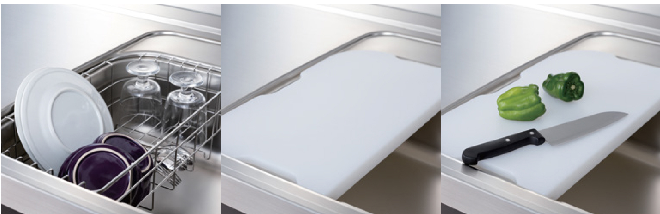 Công dụng: gác trên ray dùng để cắt như thớt thông thường hay làm tấm đậy mặt chậu,tăng diện tích thao tác bếp.