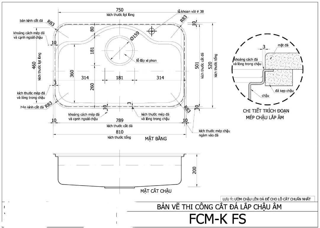 – Kích thước cắt đá (lắp âm) :